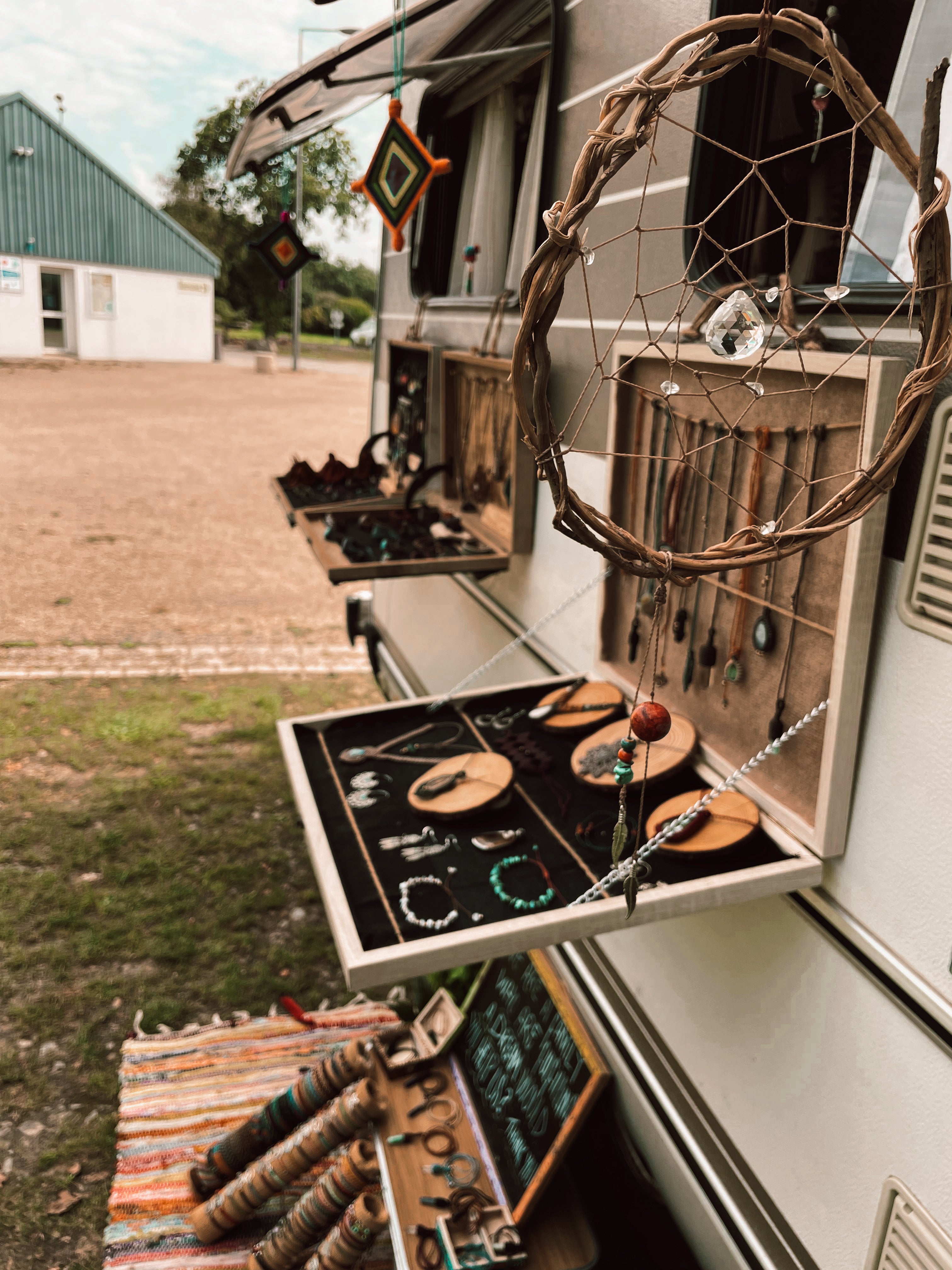 De nuestras manos surgen piezas únicas de macramé, cargadas de historia y energía natural. Cada piedra guarda un viaje, cada tejido refleja la libertad de vivir en movimiento y la belleza de lo simple.