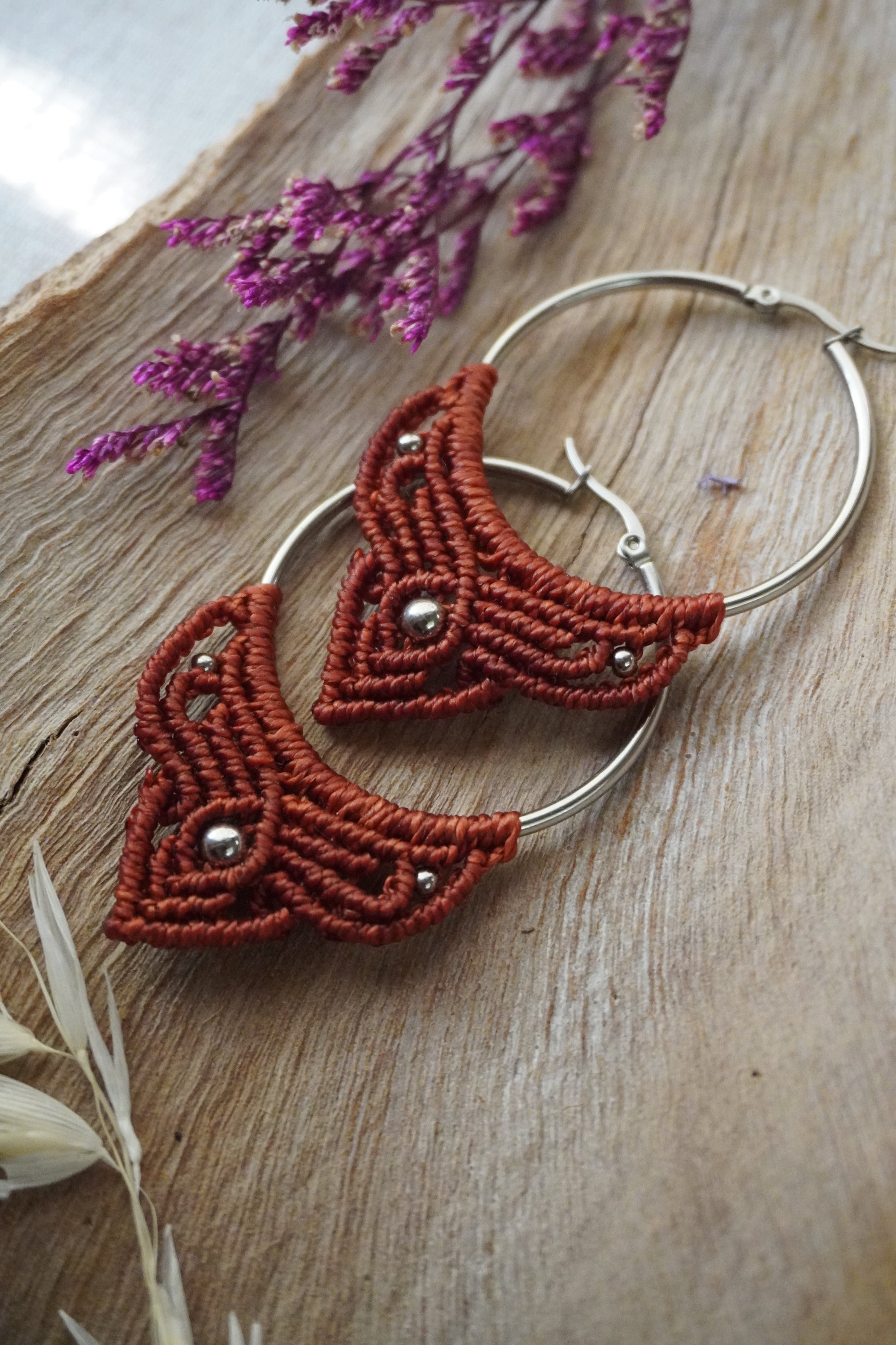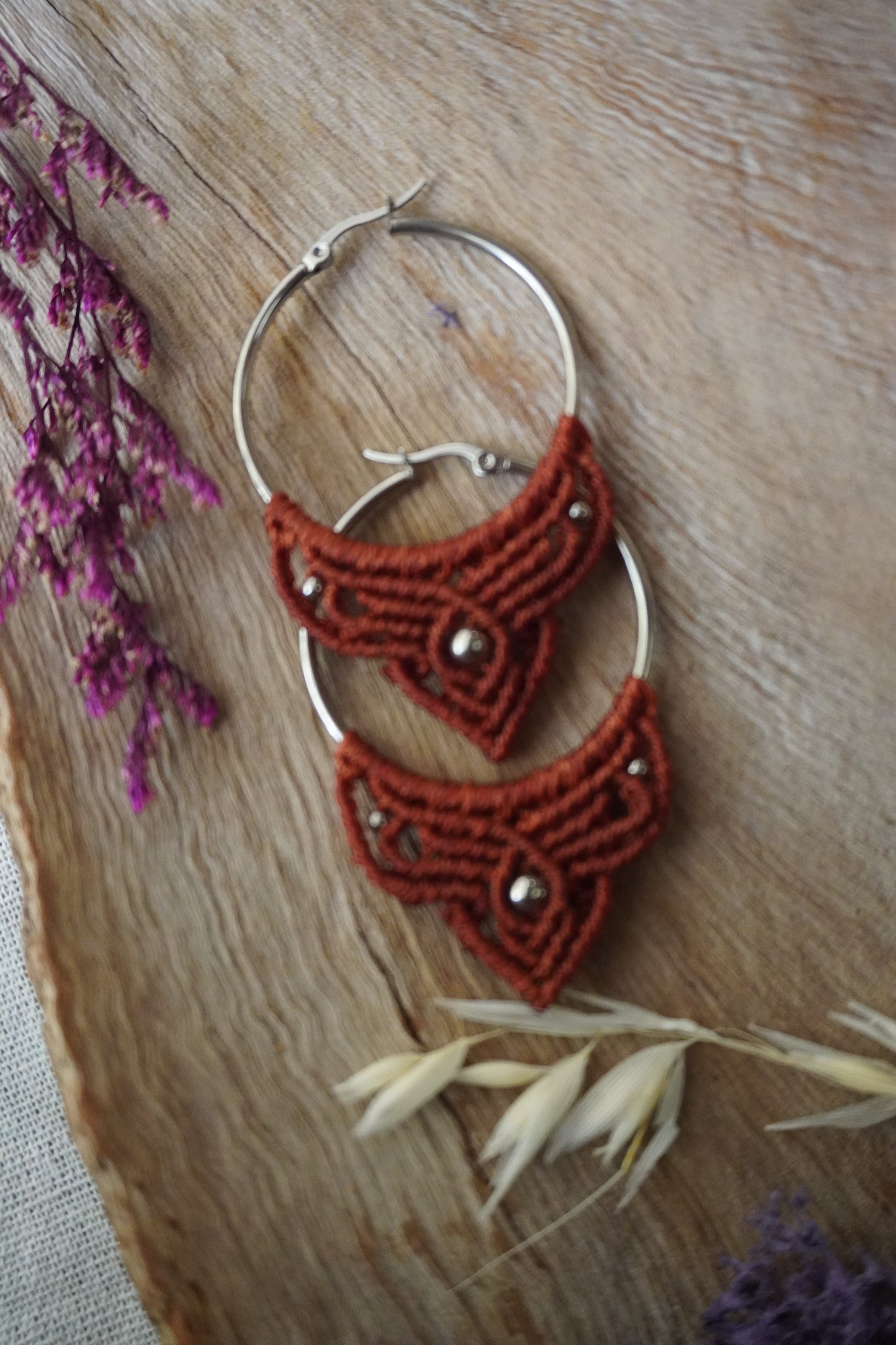Aros de macramé color granate con argolla dorada y cuentas doradas. Ligeros, cómodos y con un toque boho que ilumina cualquier look.