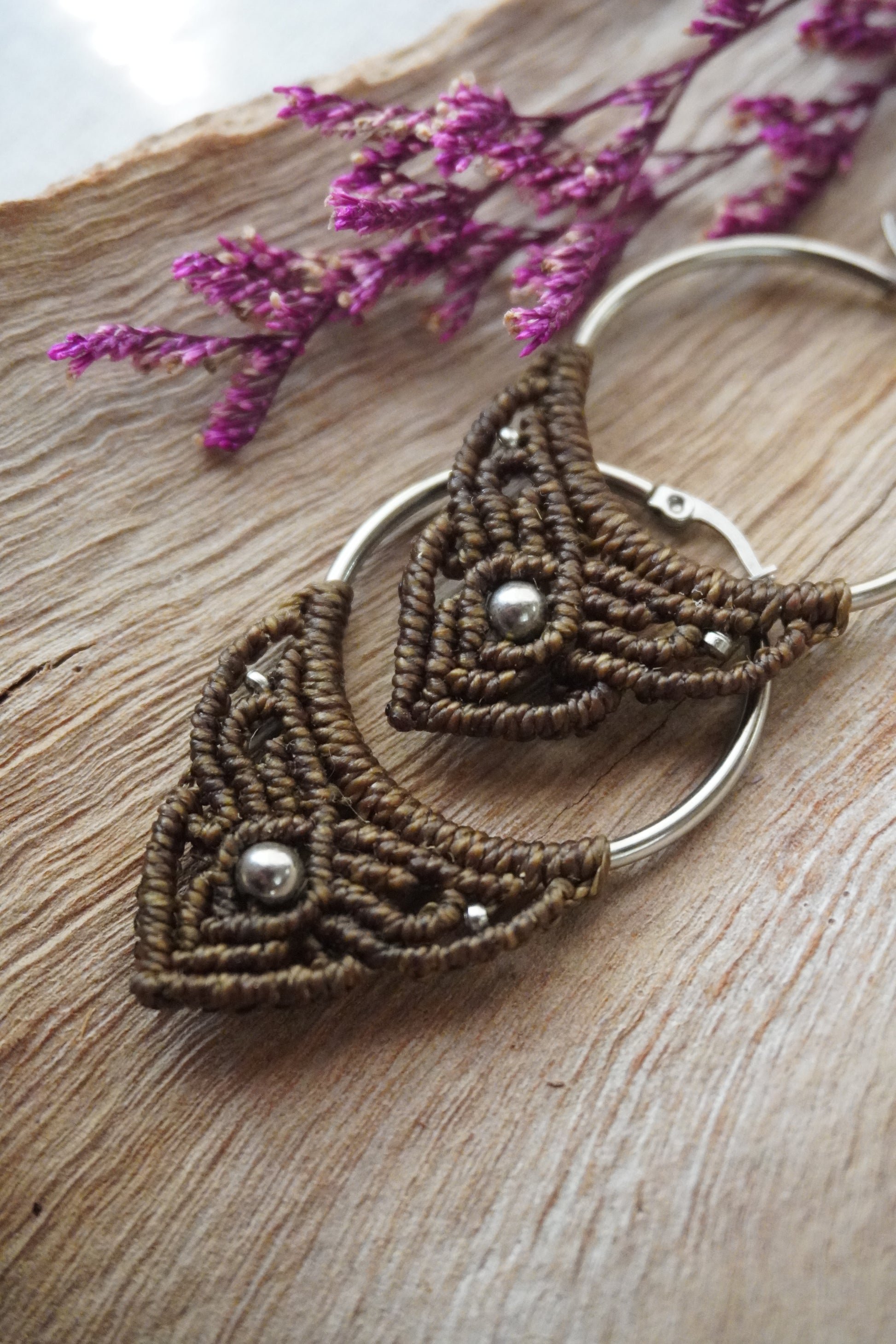 Aros de macramé en color marrón, con argolla dorada y cuentas doradas. Ligeros, cómodos y con un toque boho que ilumina cualquier look.