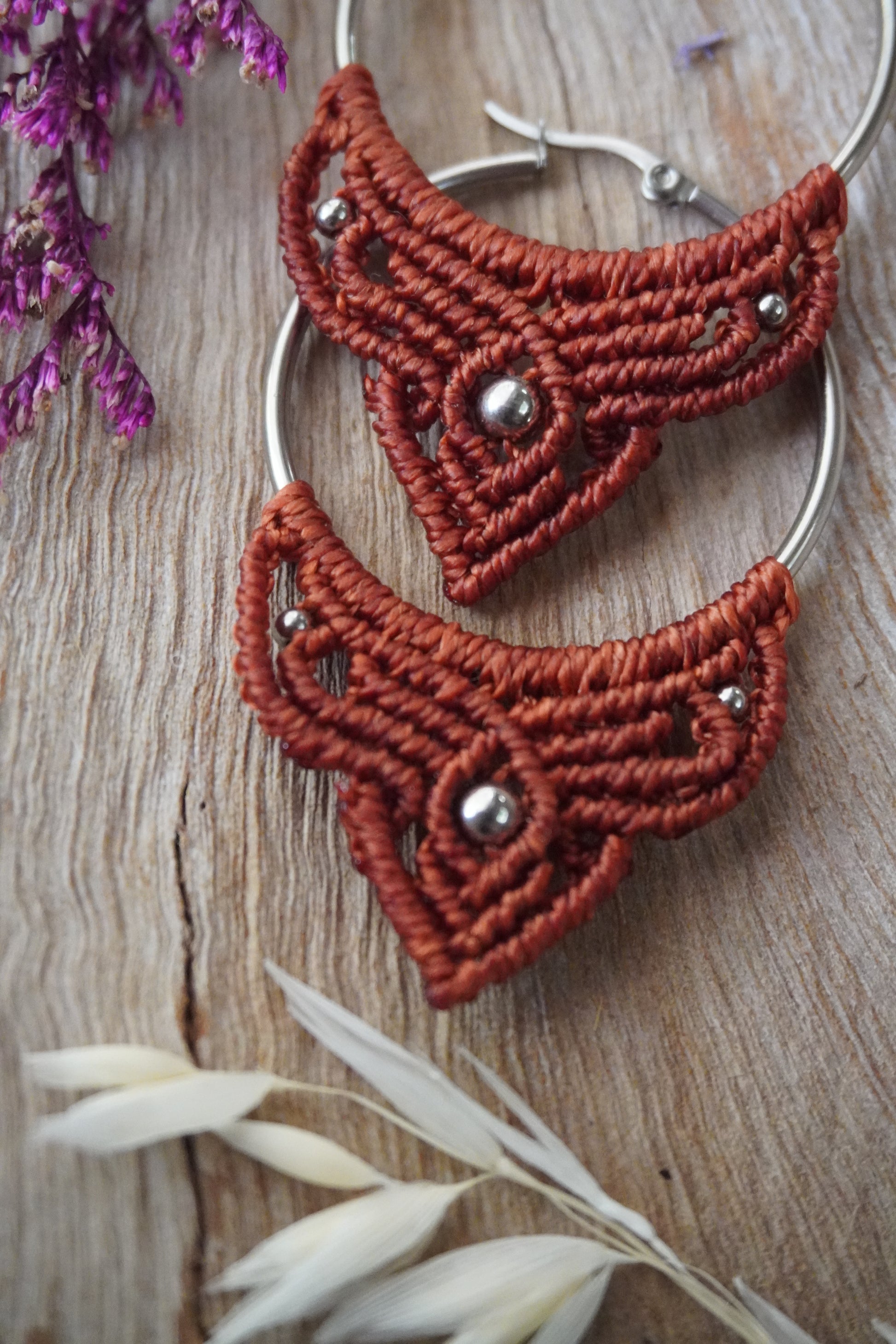 Aros de macramé color granate con argolla dorada y cuentas doradas. Ligeros, cómodos y con un toque boho que ilumina cualquier look.