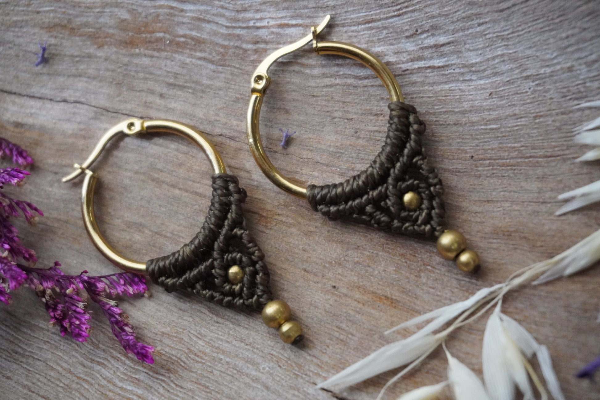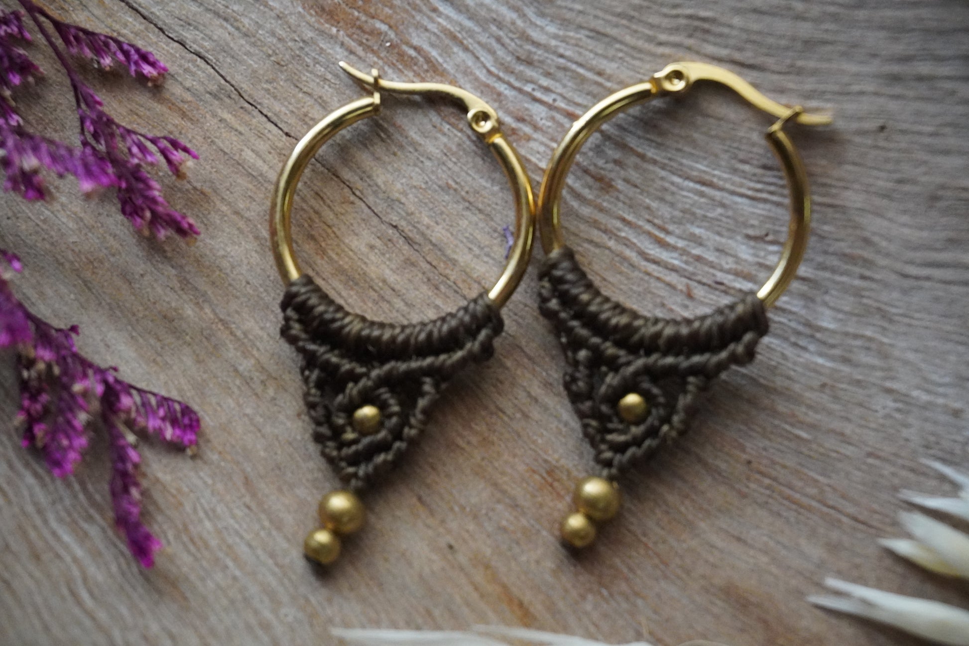Aros de macramé color marrón, talla pequeña con argolla dorada y cuentas doradas. Ligeros, cómodos y con un toque boho que ilumina cualquier look.