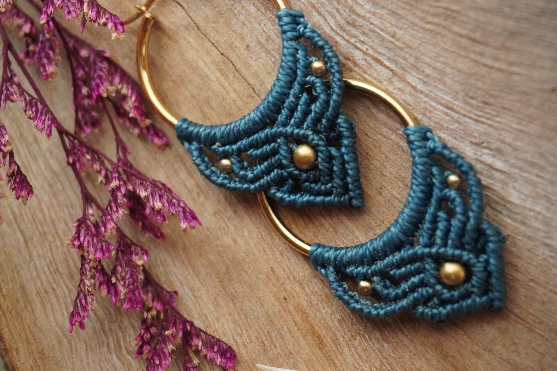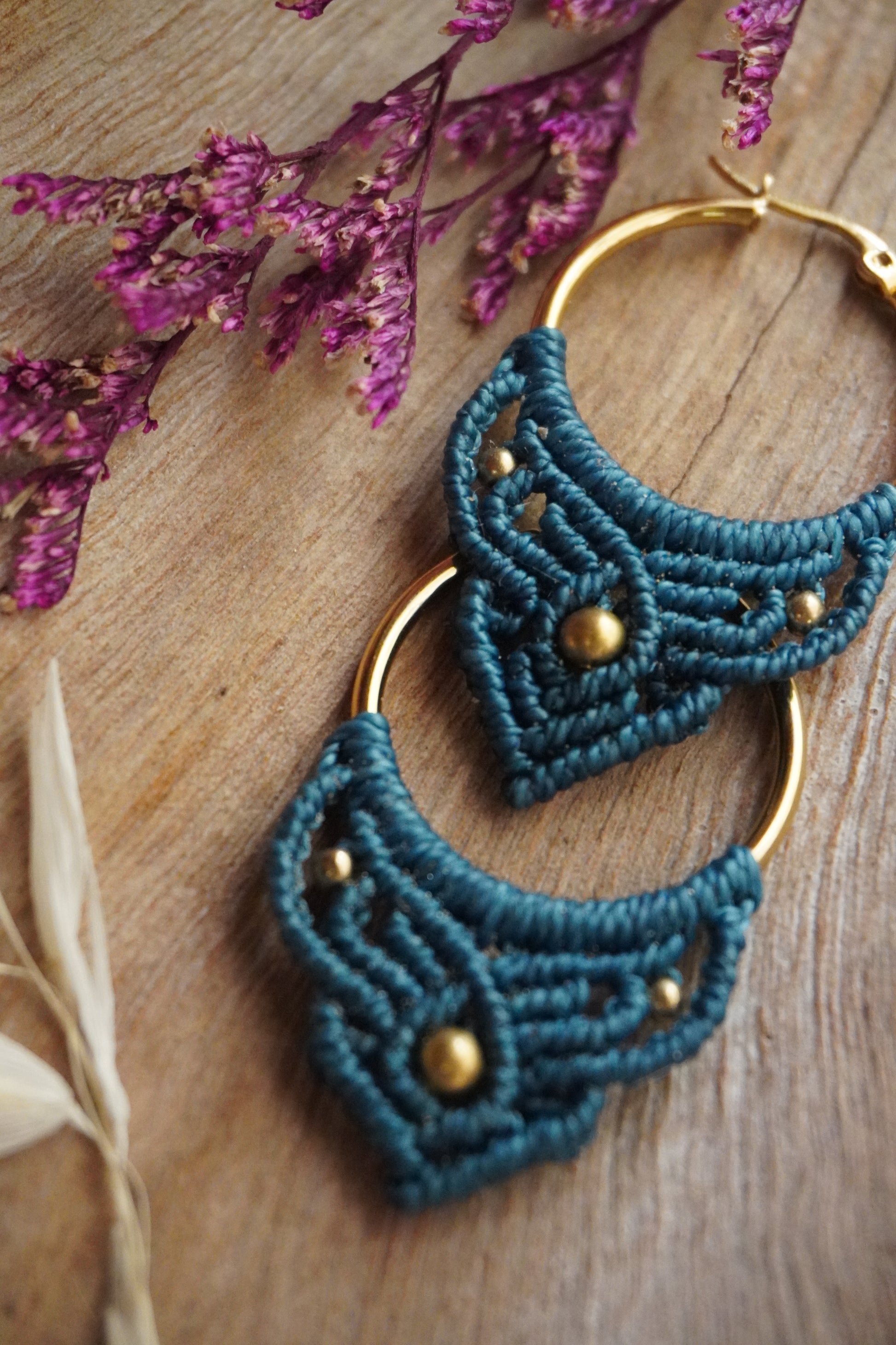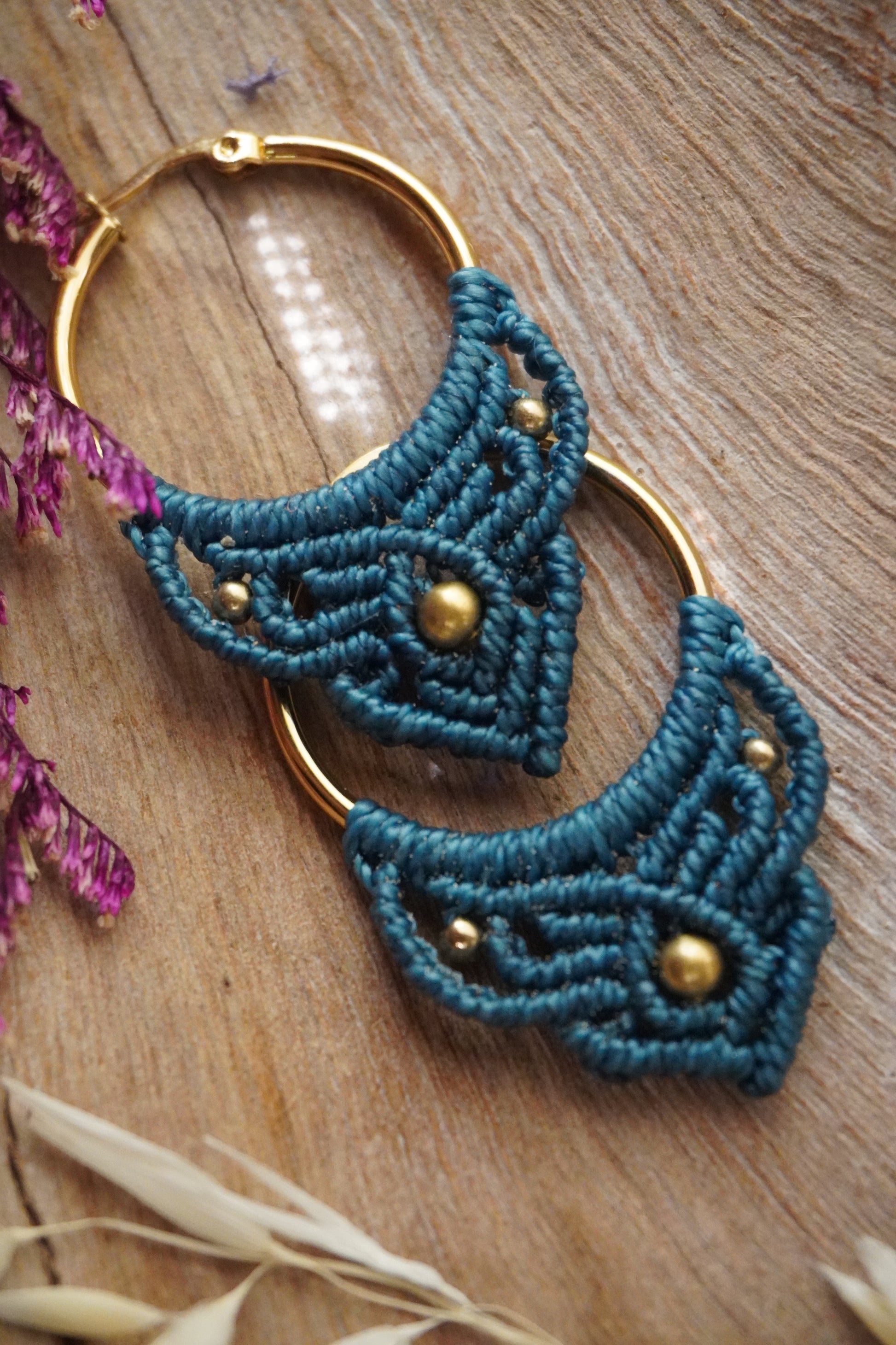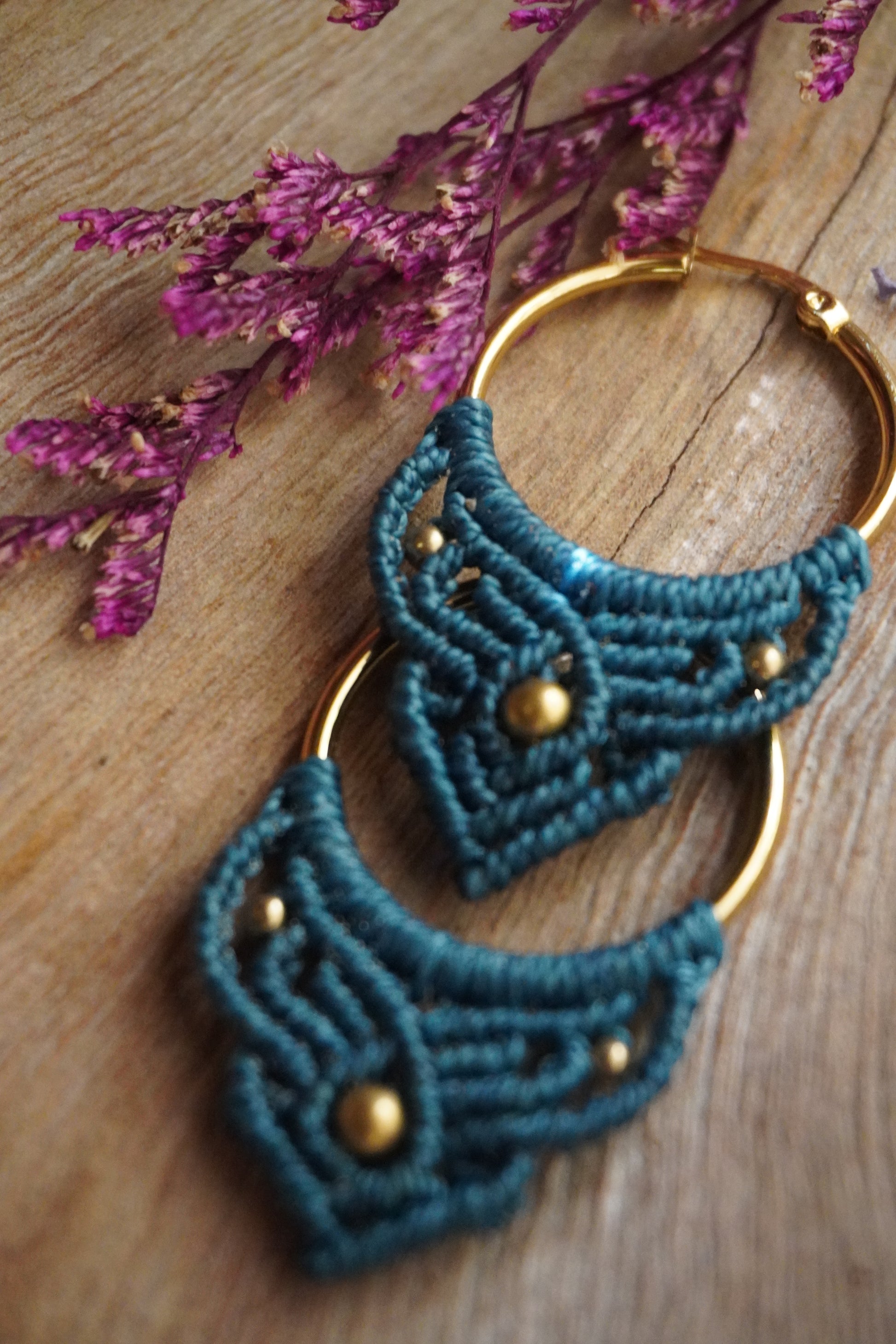 Aros de macramé en color Turquesa, con argolla dorada y cuentas doradas. Ligeros, cómodos y con un toque boho que ilumina cualquier look.