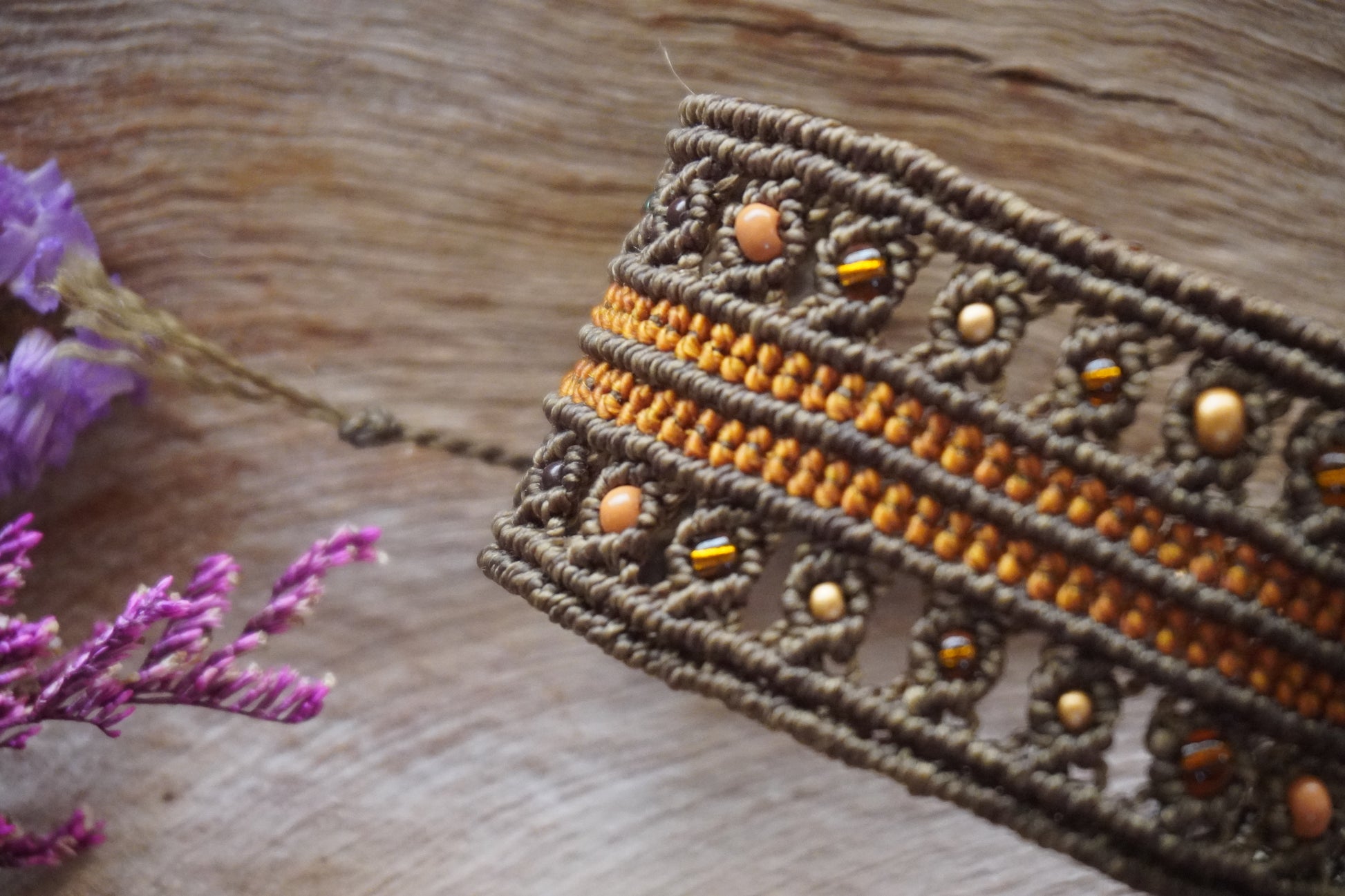 Brazalete de macramé marrón y naranja con cuentas naturales